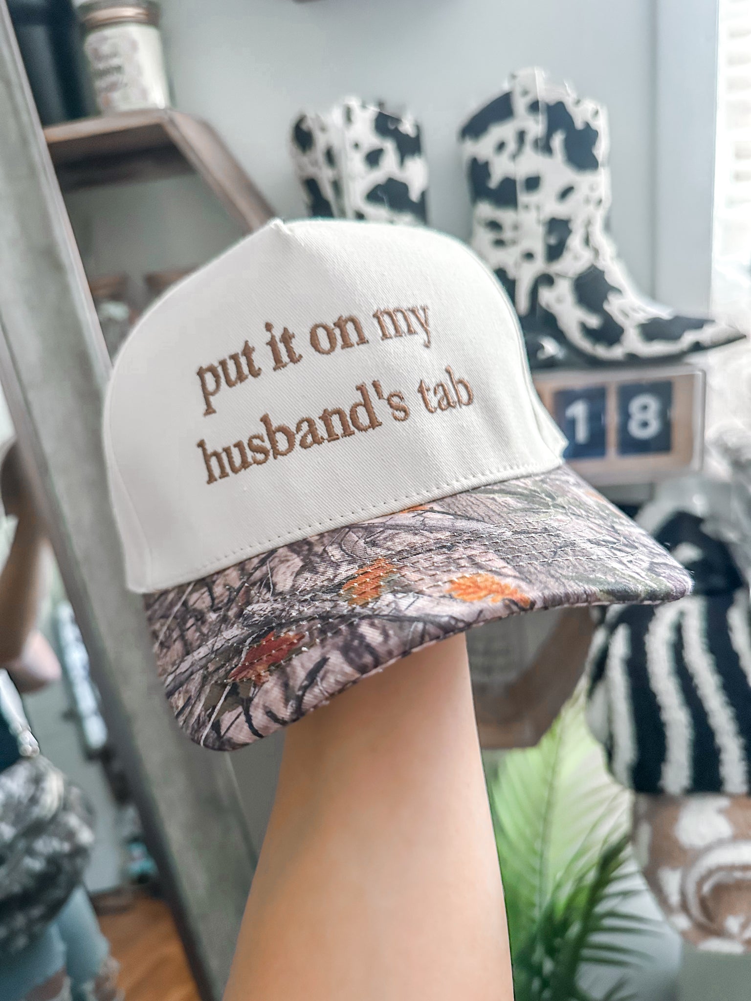 Let your hat do the talking with this playful statement piece! Featuring a classic cream crown, a rugged camo bill, and bold embroidered text that reads “Put It On My Husband’s Tab,” this cap is perfect for the woman who knows how to have fun — and isn't afraid to show it.