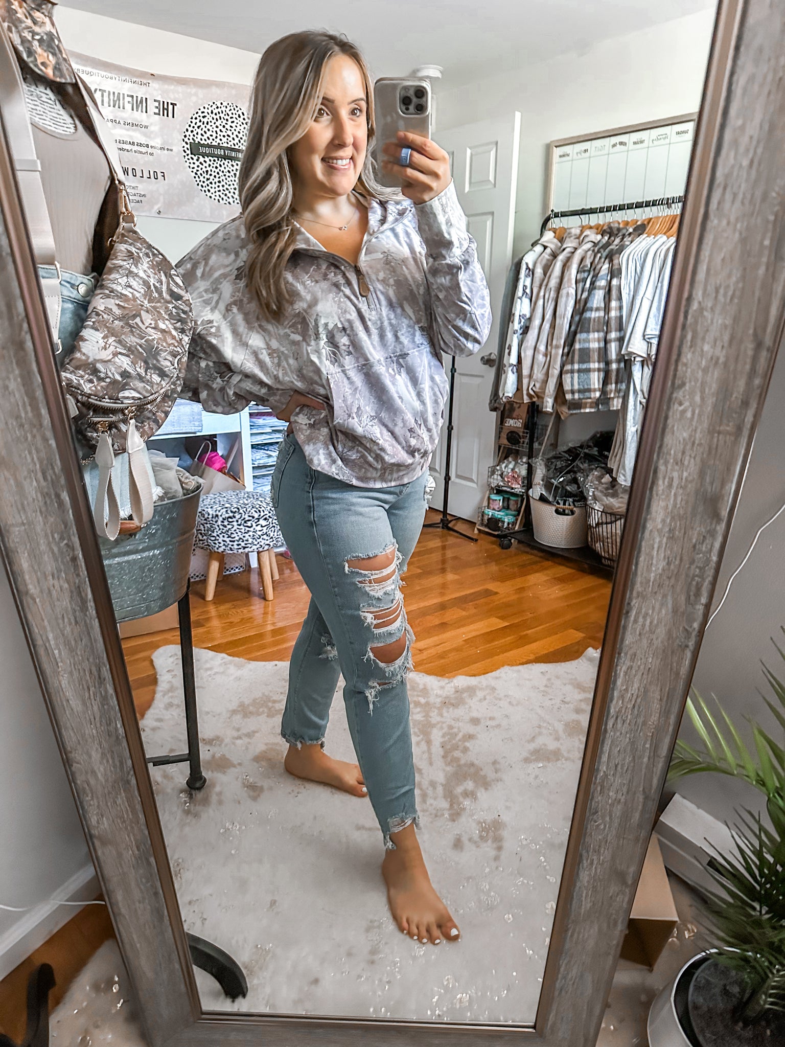 This super exclusive camo quarter zip is crafted from a summer-soft, Dri-FIT style fabric that keeps you cool and comfortable all day long. Featuring a true grey camo print, kangaroo pocket, and a flattering seam detail in the back for subtle shaping, it’s equal parts function and style. The true-to-size fit makes it perfect for workouts, weekends, and everything in between.