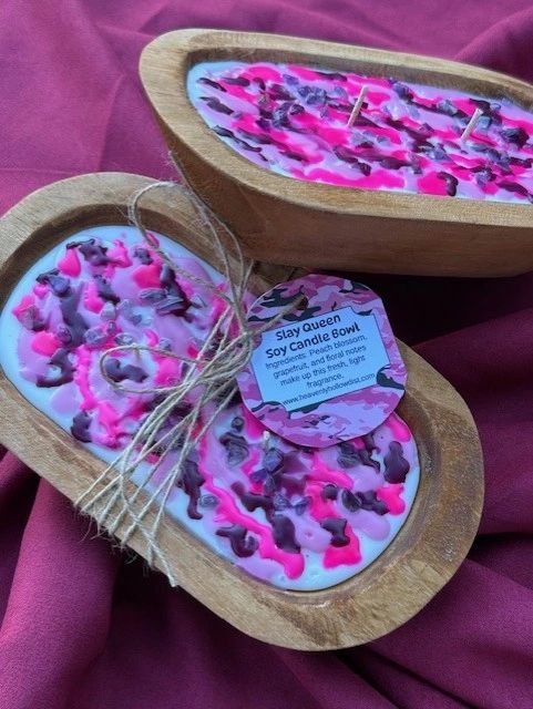 Slay Queen Wooden Dough Bowl Candle: This unique candle features a Tie Dye print wooden dough bowl design. Perfect for those who love to hustle harder! 🌸